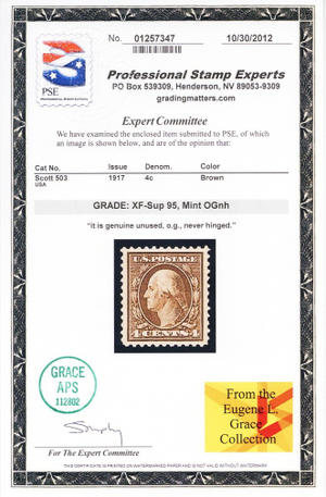 Due to the high cost of obtaining certificates we will only refund the cost of the stamp and not the cost of the certificate for stamps that sell for less than $250 that come back with a negative certificate. Stamps that sell for above $250 will receive a full refund for both the price of the stamp and cost of the certificate if it should come back not as described. For U.S. stamps only certificates from either APS, PSE or from the Philatelic Foundation are accepted, however "graded" certificates or "encased" items are not accepted.
