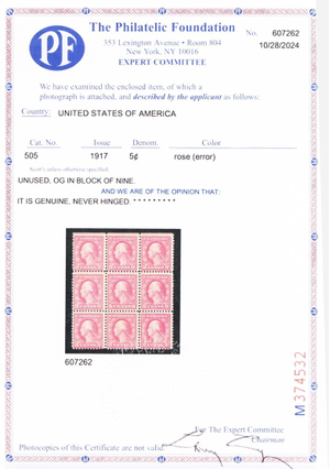 505, Mint NH 5¢ Error In Block of Nine - PFC Certificate - Stuart Katz