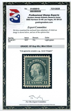 511, 11¢ Franklin, PSE Graded XF-Sup 95J Mint NH Certificate, SMQ $275