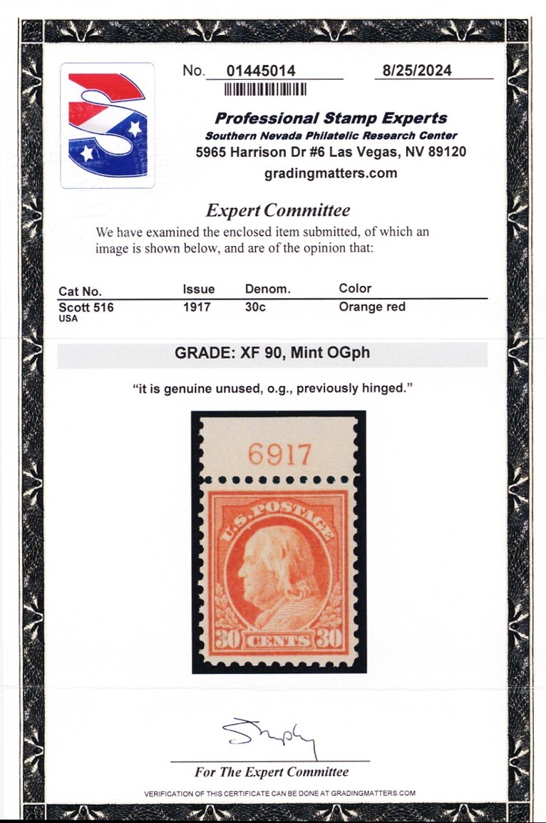 516, Mint LH 30¢ PL# With Graded 90 PSE Certificate - Stuart Katz