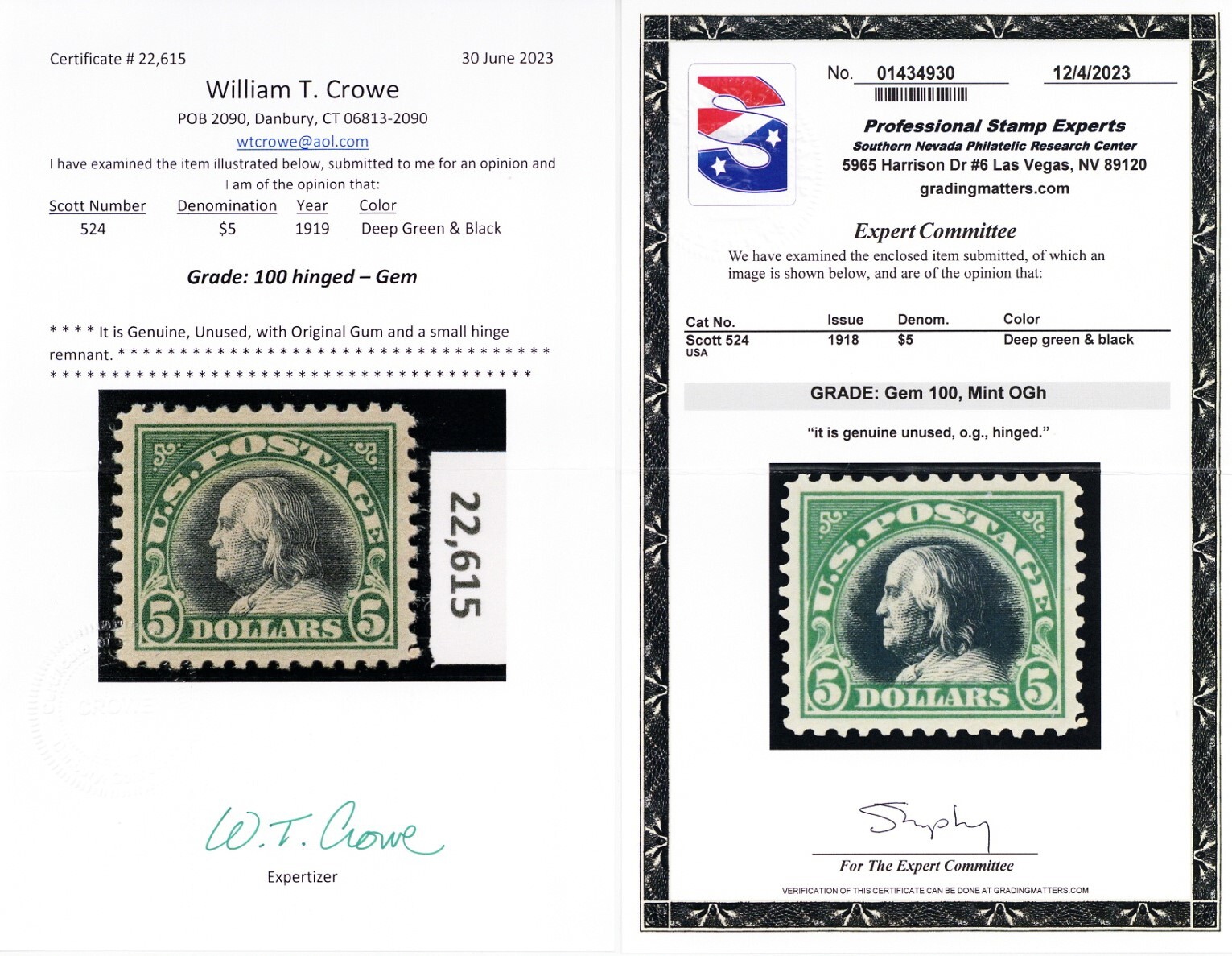 524, Mint Superb H $5 With Graded 100 GEM PSE Certificate - Stuart Katz