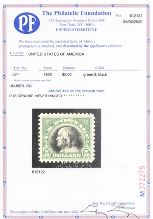 524, Mint VF/XF NH $5 Franklin - With PFC Certificate - Stuart Katz