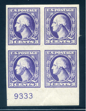 535, 3¢ Offset Washington, block of 4, Mint NH, light gum bends, Scott $75