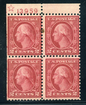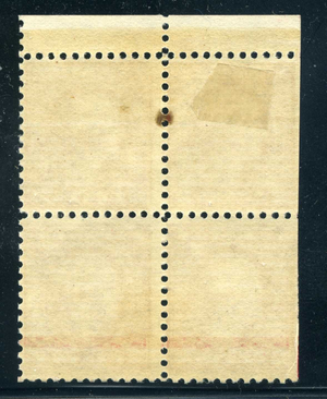 A genuine example of the difficult Scott #546 coil waste plate block. This piece offers peace of mind; since fakes are produced from #492 coils, a plate block of four eliminates the possibility of it being a counterfeit. Three of the stamps are Mint Never Hinged (MNH) and the top left stamp is hinged. Condition notes include the typical straight edge at the left that you always see with these coil waste plate blocks and a small oil spot between the two top stamps. This is a great, inexpensive opportunity to acquire this challenging coil waste issue.