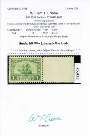 548, Mint XF NH 1¢ - With Graded 90J Jumbo Certificate - Stuart Katz