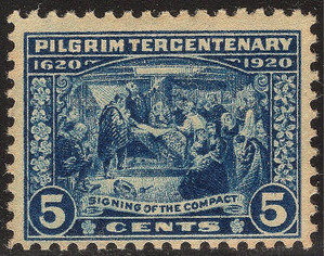Scott #550 F-VF Mint Never Hinged 5¢ Signing of the Compact from the Landing of the Pilgrims 300th Anniversary series issued in 1920. Centering is great for this normally badly centered issue. Three great margins and a typical close one at the bottom. The stamps in this series were plated close together so most of the time centering is poor especially on the 5 center. Get it into your collection. BUY IT NOW!!!