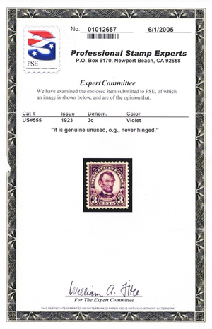 555, Mint XF NH 3¢- With PSE Certificate * Stuart Katz Description: