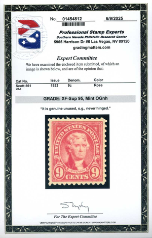 561, 9¢ Jefferson, MNH, PSE Graded XF-Sup 95 Certificate, SMQ $200