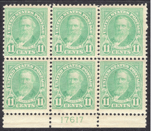 #563 F-VF MNH OG-11¢ HARRISON PERF 11 PLATE BLOCK OF 6-LIGHT GREEN BLUE-BUY ME Scott #563 F-VF MNH OG Perf 11 flat plate printing of the 11-cent Benjamin Harrison issue. Bottom plate block of 6 Fresh with nice margins.