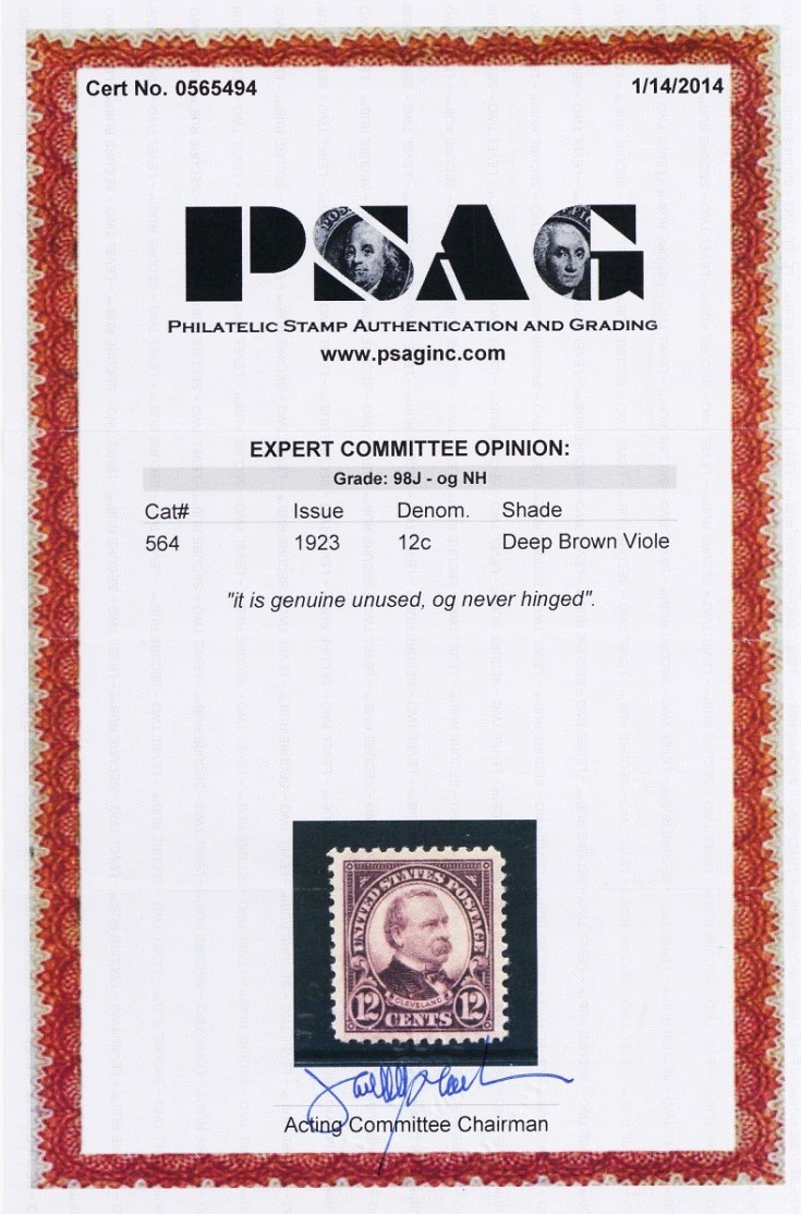 564, Mint Superb NH 12¢ - With PSAG Graded 98J JUMBO Certificate - Stuart Katz