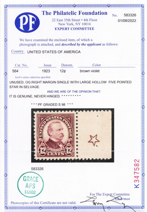 564, Mint Superb NH Graded 98 PFC Certificate - Stuart Katz