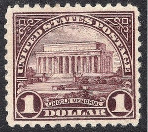 Scott #571 F-VF MNH OG Margin copy single of the Perf 11 flat plate printing of the $1 Lincoln Memorial in Washington DC issue. This is a beauty of a stamp and always popular. Fresh stamp with bottom margin selvage.