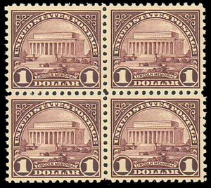 571, Mint $1 VF NH Block of Four Stamps Lincoln Memorial Cat $320 -- Stuart Katz