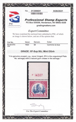 573, Mint Superb NH $5 With Graded 95J JUMBO Certificate * Stuart Katz