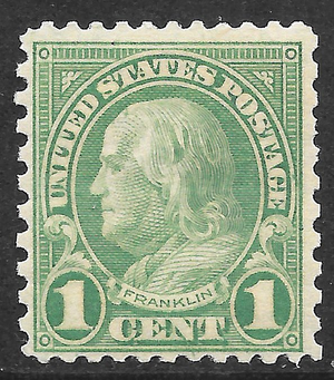 VF MNH OG Scott #578 1-cent Benjamin Franklin perf 11 X 10 coil waste printing issue. No gum problems with this one. Coil waste stamps were created from the end printings of rotary press coil stamps and then instead of cutting them into rolls for coils they were perforated on all sides and issued in sheet form. These are notoriously poorly centered so this is a pretty good example of a #578. Very fresh color for this 1 center also.
