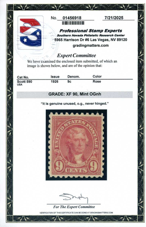 590, 9¢ perf 10 Jefferson, PSE Graded XF 90 Certificate, SMQ $85