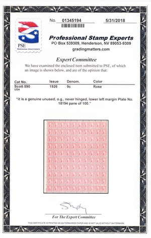 590, Mint NH 9¢ VF - Complete Sheet of 100 PSE SCV $3015.00 - Stuart Katz
