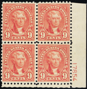 590, VF LH 9¢ Fresh Plate Block of Four Stamps Cat $150.00 - Stuart Katz
