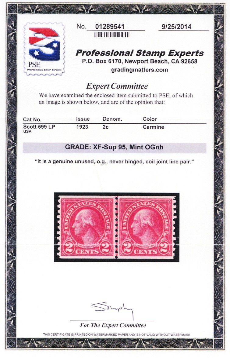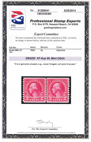 599, MNH XF/Superb 2¢ Coil Line Pair - PSE Graded 95 Certificate * Stuart Katz
