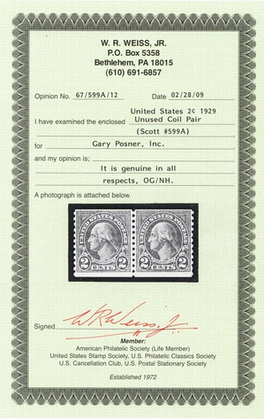 599A, Mint NH 2¢ Coil Pair - With Certificate - Stuart Katz