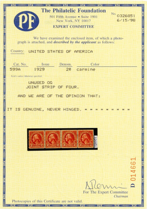 Due to the high cost of obtaining certificates we will only refund the cost of the stamp and not the cost of the certificate for stamps that sell for less than $250 that come back with a negative certificate. Stamps that sell for above $250 will receive a full refund for both the price of the stamp and cost of the certificate if it should come back not as described. For U.S. stamps only certificates from either APS, PSE or from the Philatelic Foundation are accepted, however "graded" certificates or "encased" items are not accepted.