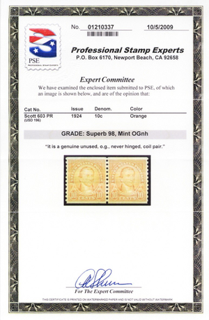 603, Mint Superb NH 10¢ Coil Pair - Graded 98 PSE Certificate * Stuart Katz