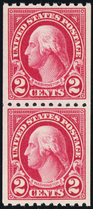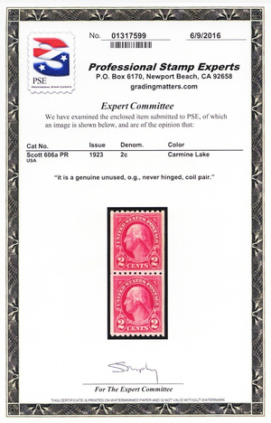 606a, Mint VF NH 2¢ Carmine Lake Color Coil Pair - With PSE Cert -- Stuart Katz