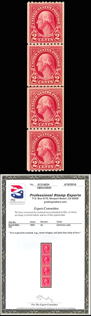 606a, MNH VF 2¢ RARE Carmine Lake Shade Line Strip/4 PSE Cat $1,115 Stuart Katz