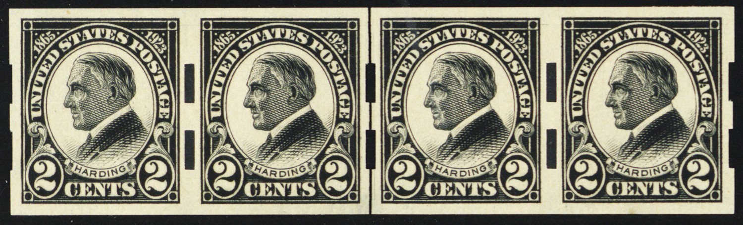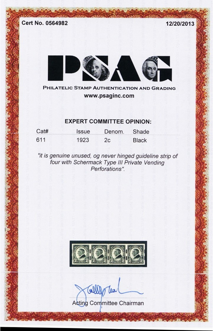 611, Mint XF NH - Guide Line Strip of 4 Schermack Perfs With Cert - Stuart Katz