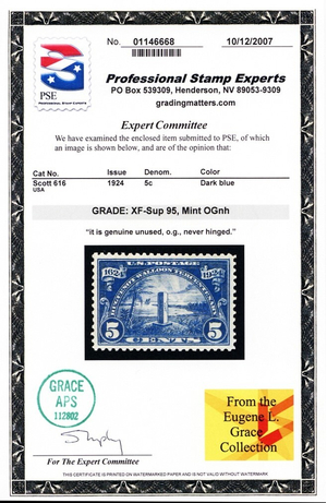 Due to the high cost of obtaining certificates we will only refund the cost of the stamp and not the cost of the certificate for stamps that sell for less than $250 that come back with a negative certificate. Stamps that sell for above $250 will receive a full refund for both the price of the stamp and cost of the certificate if it should come back not as described. For U.S. stamps only certificates from either APS, PSE or from the Philatelic Foundation are accepted, however "graded" certificates or "encased" items are not accepted.