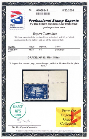 616, Mint XF NH 5¢ BROKEN CIRCLE - PSE Certificate Graded 90 * Stuart Katz