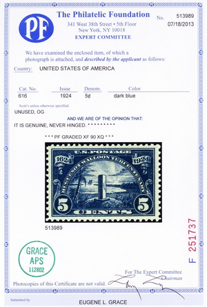 Due to the high cost of obtaining certificates we will only refund the cost of the stamp and not the cost of the certificate for stamps that sell for less than $250 that come back with a negative certificate. Stamps that sell for above $250 will receive a full refund for both the price of the stamp and cost of the certificate if it should come back not as described. For U.S. stamps only certificates from either APS, PSE or from the Philatelic Foundation are accepted, however "graded" certificates or "encased" items are not accepted.