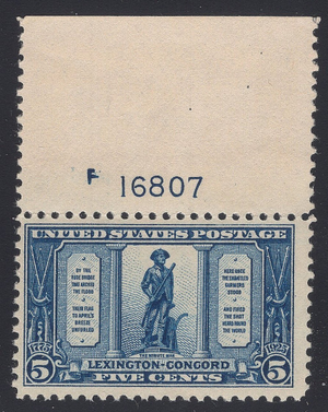 | #619 VF MNH OG-TOP PLATE NUMBER SINGLE STAMP Fabulous VF MNH OG Scott #619 5-center from the Lexington-Concord commemorative Series. Get this one in your collection today