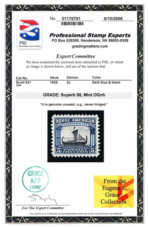Due to the high cost of obtaining certificates we will only refund the cost of the stamp and not the cost of the certificate for stamps that sell for less than $250 that come back with a negative certificate. Stamps that sell for above $250 will receive a full refund for both the price of the stamp and cost of the certificate if it should come back not as described. For U.S. stamps only certificates from either APS, PSE or from the Philatelic Foundation are accepted, however "graded" certificates or "encased" items are not accepted.