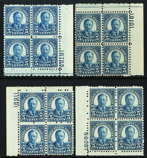 637, Mint NH 5¢ Four Plate Blocks CV $70.00 - Stuart Katz