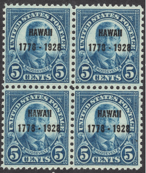 Scott #648 XF MNH OG block of 4 of the 5-cent Hawaii Overprint with nice margins and clearly inked overprint. Tough to find the overprints with margins like this. Get this one into your collection now.