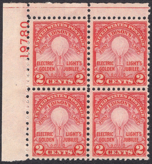 | #655 VF MNH OG EDISON LIGHT BULB PLATE BLOCK!! VF MNH OG LL PLATE BLOCK OF 4 of Scott #655 2 cent Edison light bulb commemorative, rotary press printing version. Great centering on this issue is extremely difficult in plate block form. Here's your chance to buy a beauty