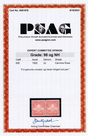 656, Mint /Superb NH 2¢ Pair With Graded 98 PSAG Certificate - Stuart Katz