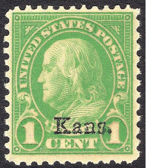 Scott #658 VF-XF MNH OG 1-cent Benjamin Franklin Kansas Overprint. This stamp was taken from a partial sheet so it's not going to be bogus for sure. Has single gum gripper bar on stamp and the nicest centering you're going to find on most Kansas-Nebraska Overprints.