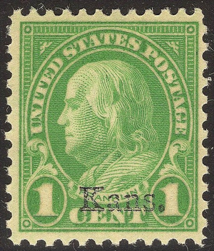 Scott #658 VF-XF MNH OG 1-cent Benjamin Franklin Kansas Overprint. This stamp was taken from a partial sheet so it's not going to be bogus for sure. Has single gum gripper bar on stamp and the nicest centering you're going to find on most Kansas-Nebraska Overprints.