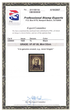 665, Mint VF/XF NH 7¢ With PSE Graded 85 Certificate * Stuart Katz