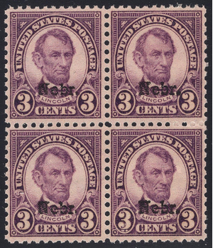 Scott #672 F-VF MNH OG 3-cent Abraham Lincoln Nebraska Overprint block of four with great margins. Tough to find the overprints with decent margins. This block was taken from a partial sheet so it's not going to be bogus for sure. Get this one into your collection now.