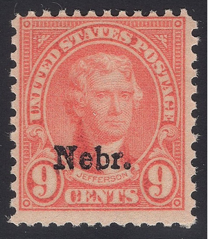 Scott #679 F-VF MNH OG 9-cent Thomas Jefferson Nebraska Overprint with nice margins and clearly inked overprint. This stamp was from a set of sheets broken up and guaranteed it's genuine. Get this one into your collection now.