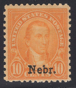 Scott #679 F-VF MNH OG 10-cent James Monroe Nebraska Overprint with nice margins and clearly inked overprint. Margin stamp with attached selvage. This stamp was from a set of sheets broken up and guaranteed it's genuine. Tough to find the overprints with margins like this. Get this one into your collection now.
