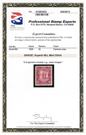 No refunds will be made after 60 days after the sale date unless extra time is granted. Due to the high cost of obtaining certificates we will only refund the cost of the stamp and not the cost of the certificate. For U.S. stamps only certificates from either APS, PSE or from the Philatelic Foundation are accepted, however "graded" certificates or "encased" items are not accepted.