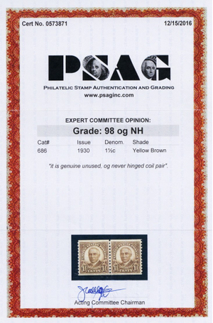 686, Mint NH Superb Coil Pair - PSAG Graded 98 Certificate - Stuart Katz