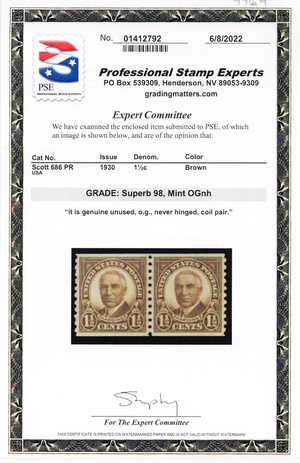 686, Mint NH Superb Pair With Graded 98 PSE Certificate * Stuart Katz