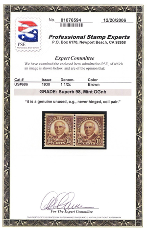 686, Mint Superb NH Coil Pair With Graded 98 PSE Certificate * Stuart Katz