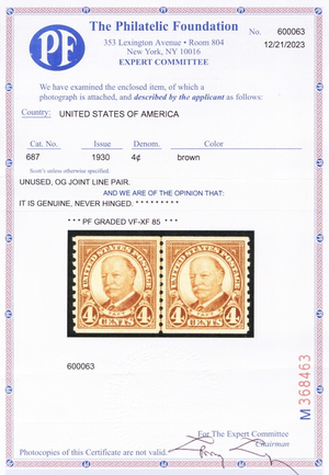 687, Mint NH VF/XF Coil Line Pair - PFC Graded 85 Certificate ** Stuart Katz