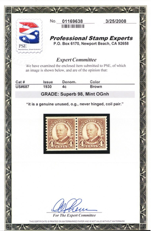 687, Mint Superb NH 4¢ Coil Pair - Graded 98 PSE Certificate * Stuart Katz